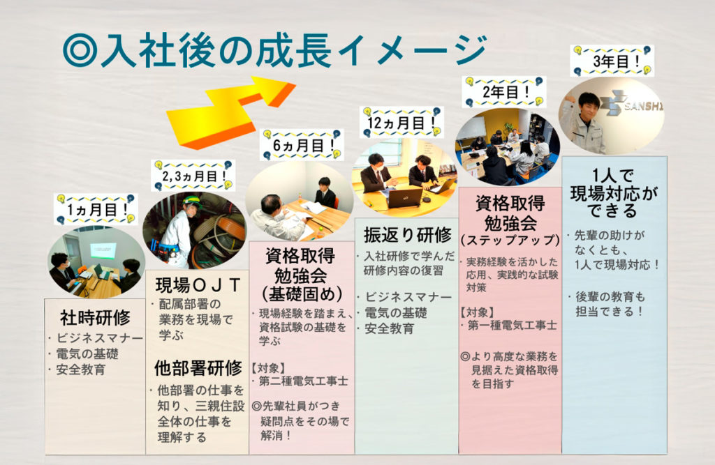 | 給与 | 高校卒 214,600円 専門卒 225,800円 大学卒 231,800円 「第二種電気工事士」を取得すると基本給3,000円アップ! 「第一種電気工事士」を取得すると基本給5,000円アップ! |